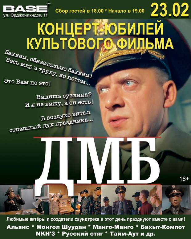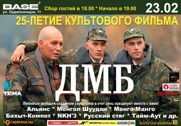 23 февраля в клубе «Base» (Орджоникидзе 11) отмечает 25-ти летие культовый фильм «ДМБ».